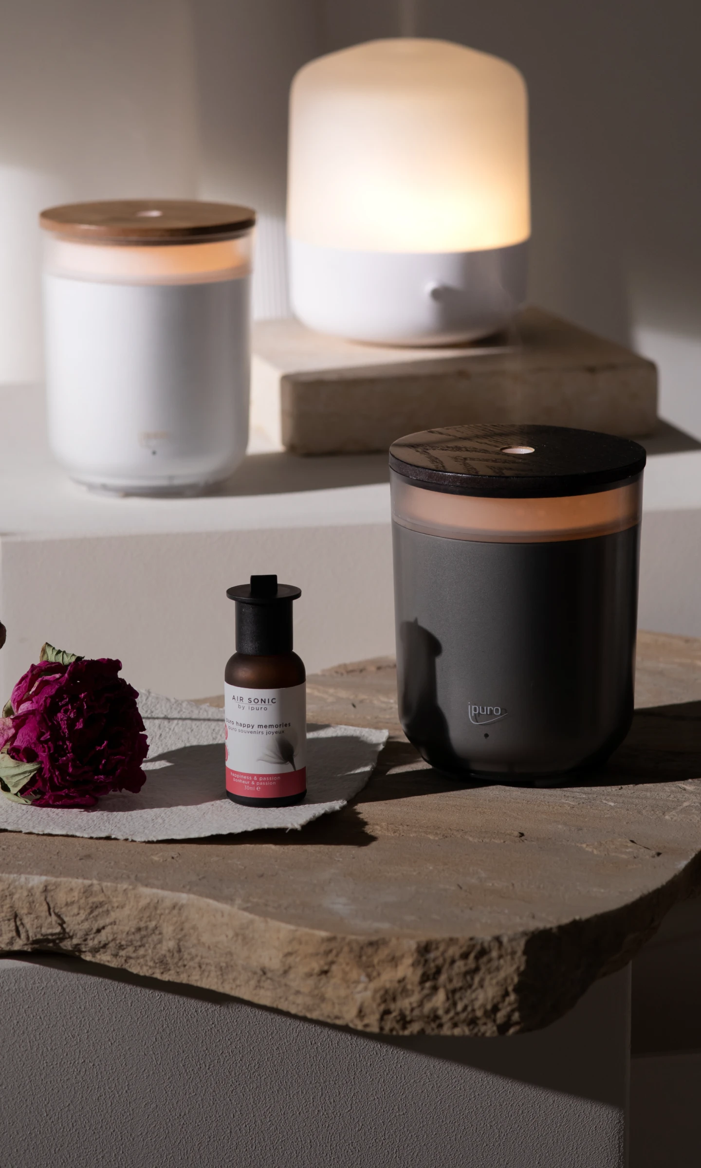 Innovativ, berührend, persönlich – Der ipuro AIR SONIC aroma mood Diffuser mit integriertem Akku und kuppelförmigem Glasdeckel für ein optimales Ambientelicht. Warmweiß- und farbiges Licht in 3 Helligkeitsstufen.